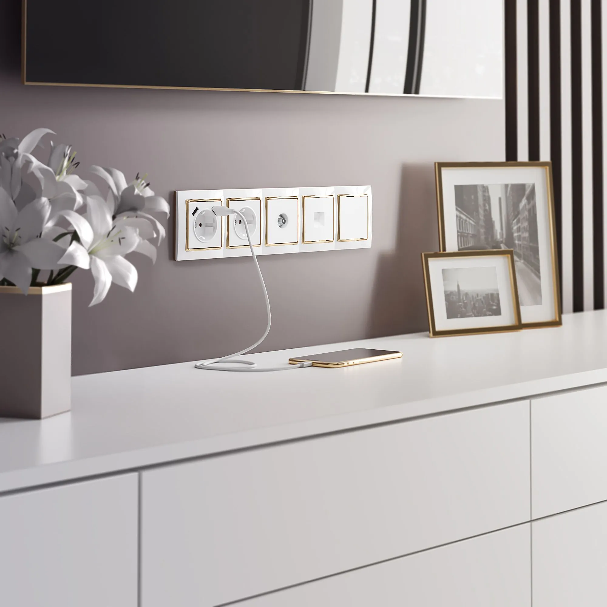 После монтажа остаётся видна только лицевая панель и декоративная рамка, что делает розетку практически незаметной на стене. Благодаря полной совместимости со всеми рамками Werkel, вы легко подберёте цвет и стиль под любой интерьер — от классического до ультрасовременного.