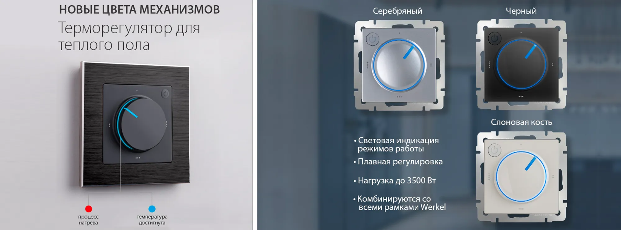 Werkel™ представляет новинку ассортимента – терморегулятор для теплого пола. Устройство предназначено для регулировки температуры поверхности пола в помещениях. Терморегулятор совместим со всеми типами теплых полов и рассчитан нагрузку до 3500 Вт. Совместимый со всеми рамками Werkel™ терморегулятор оснащен светодиодной индикацией режимов работы. Максимальная температура нагрева составляет 50°C. Включение красного светодиода сигнализирует о процессе нагрева. При достижении заданной температуры включается синяя подсветка.